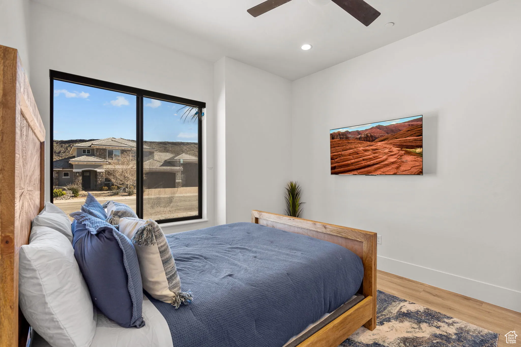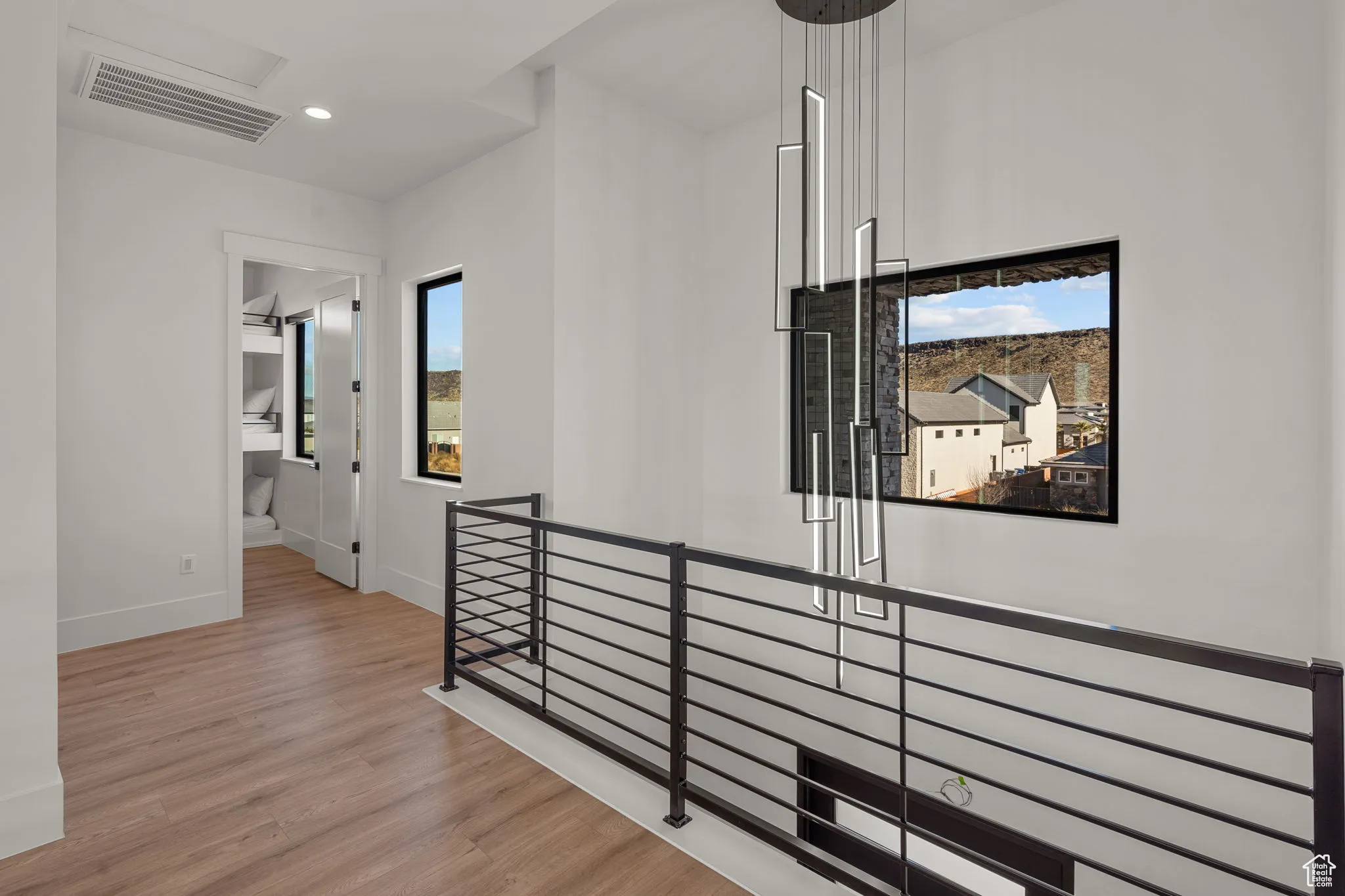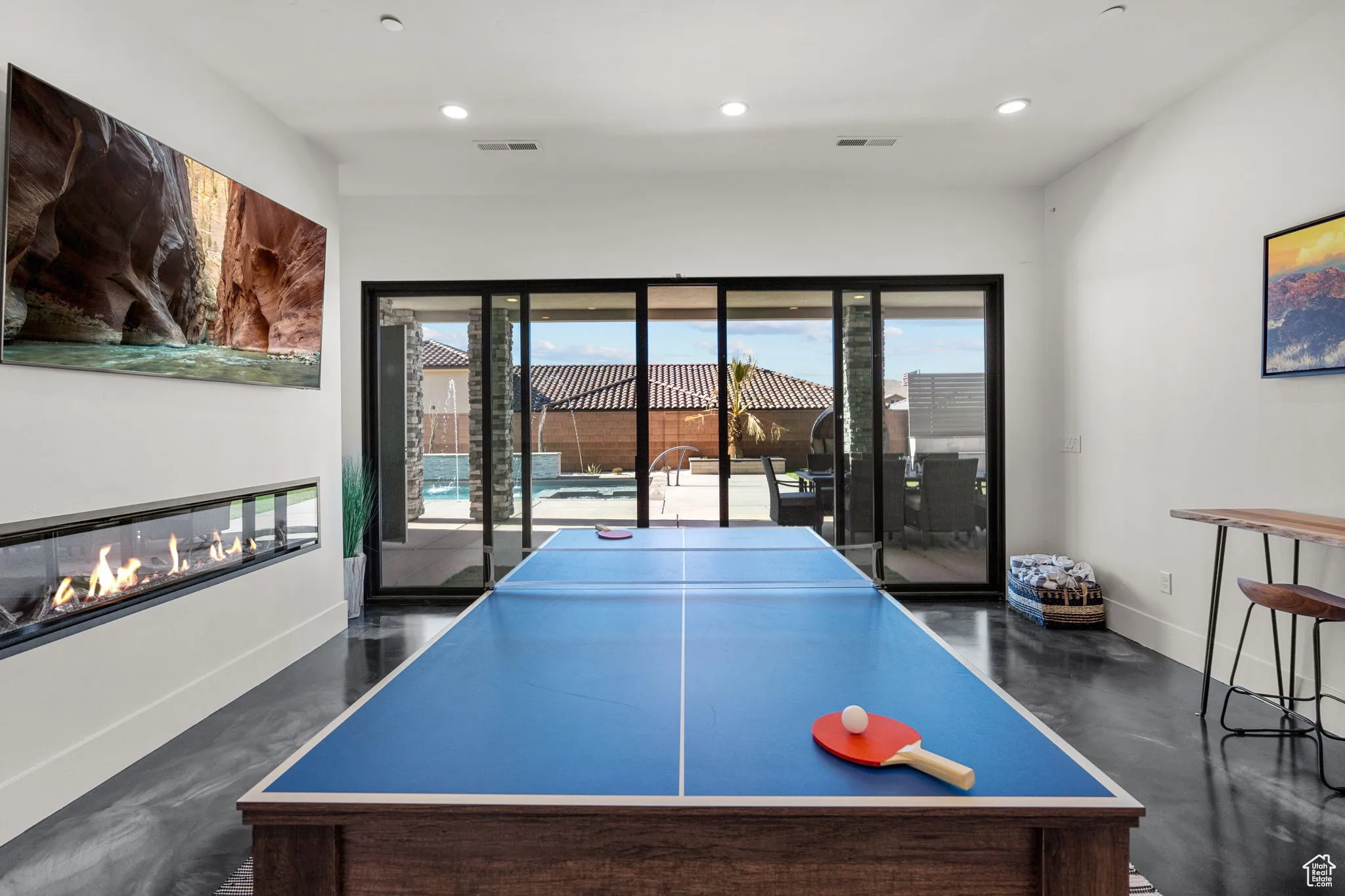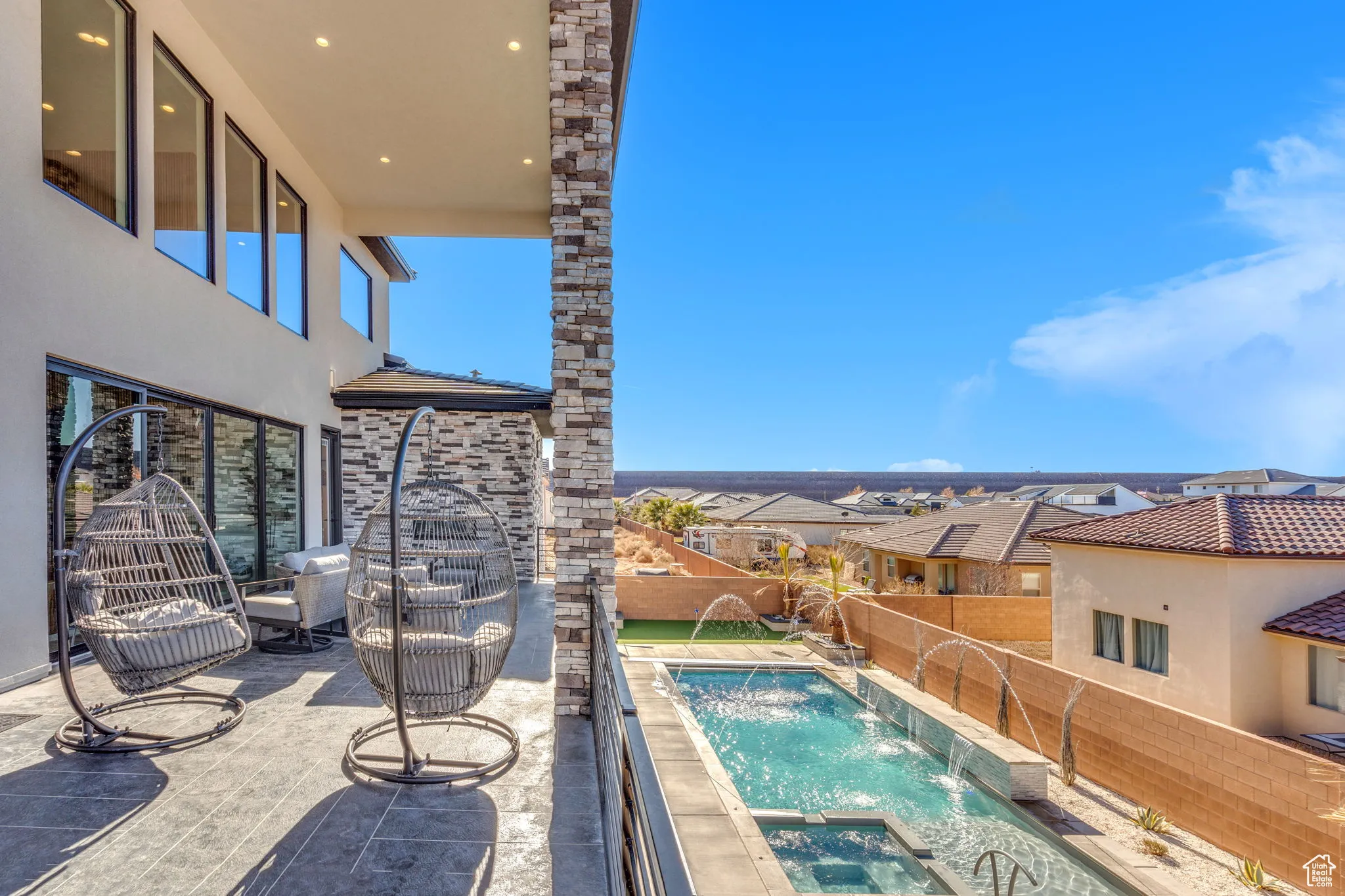 Fractional ownership available. This newly built custom home seamlessly blends modern and rustic styling as you open the large custom pivot door into the entry with lofty ceilings, modern fixtures and rustic wood accent wall on the towering fireplace in the great room. The large kitchen with hidden pantry, built in ice maker, full size side-by-side fridge and freezer and two dishwashers makes it great for entertaining. A set of double sliding doors on the main level open the great room up to a large deck with hot tub where you can take in the sunset or overlook the backyard featuring a pool and hot tub, outdoor fire pit with built in seating, putting green, pool bathroom, and outdoor kitchen area. Full daylight walkout basement with 10′ ceilings also features double sliding doors out to the covered patio, making the transition from indoor to outdoor living effortless. Back inside you’ll find 5 primary style bedrooms each containing en suite bathrooms. Two additional bedrooms on the upper level have built in bunk beds. The garages offer storage space for all your toys- with an RV garage on a suspended slab and extra garage underneath. RV garage also features a condensed pickleball court and basketball standard. House is just a 5 minute drive to Sand Hollow Reservoir. 3 minute walk from all-abilities park with dog park and pickleball courts. Whether you are looking for a vacation home or to feel like you’re on vacation at home, this custom home was designed for you. Furnishings and household goods are negotiable and may be added with a separate bill of sale for $120,000 making this home turn-key. Listing agent is related to seller.