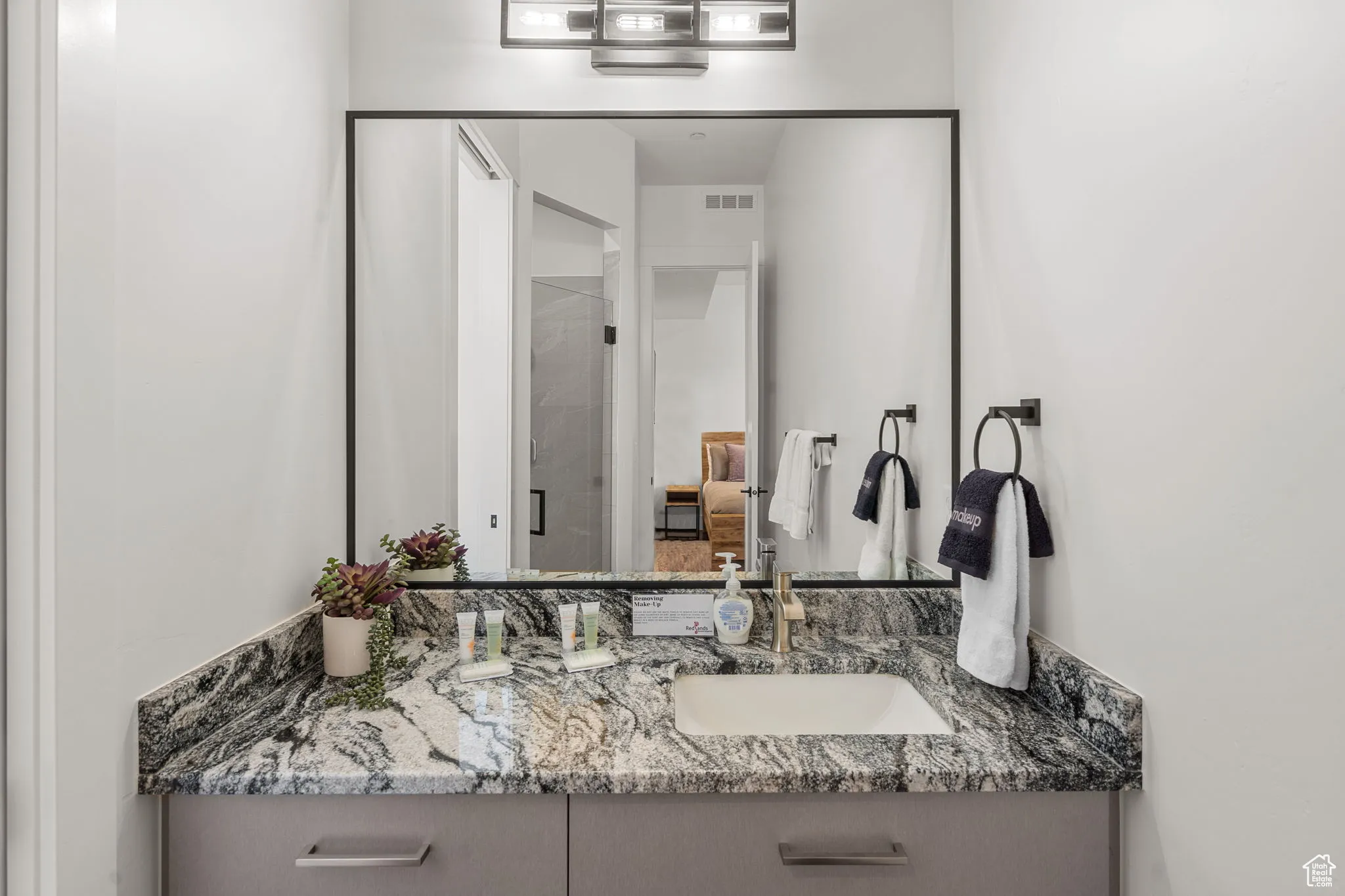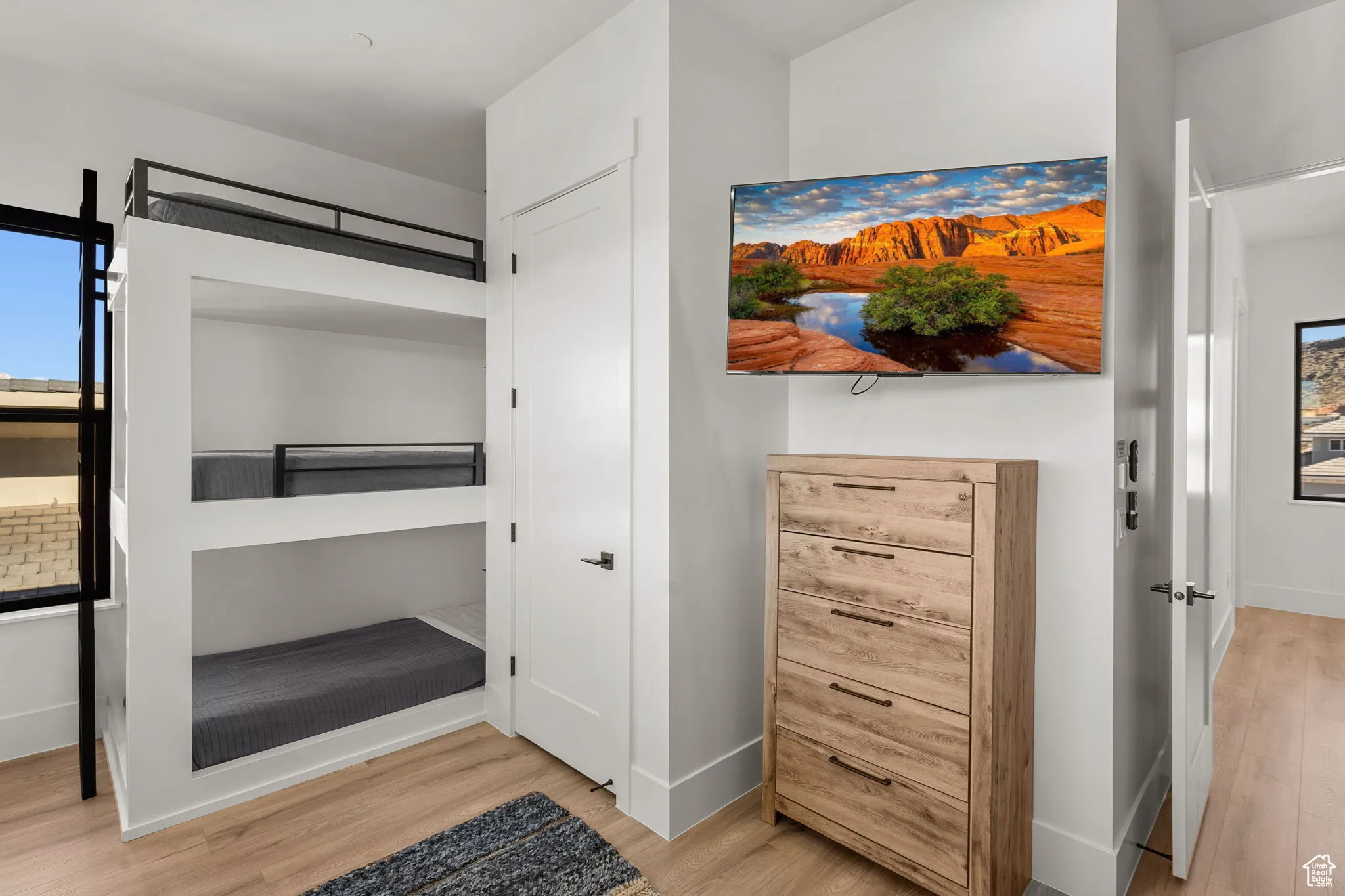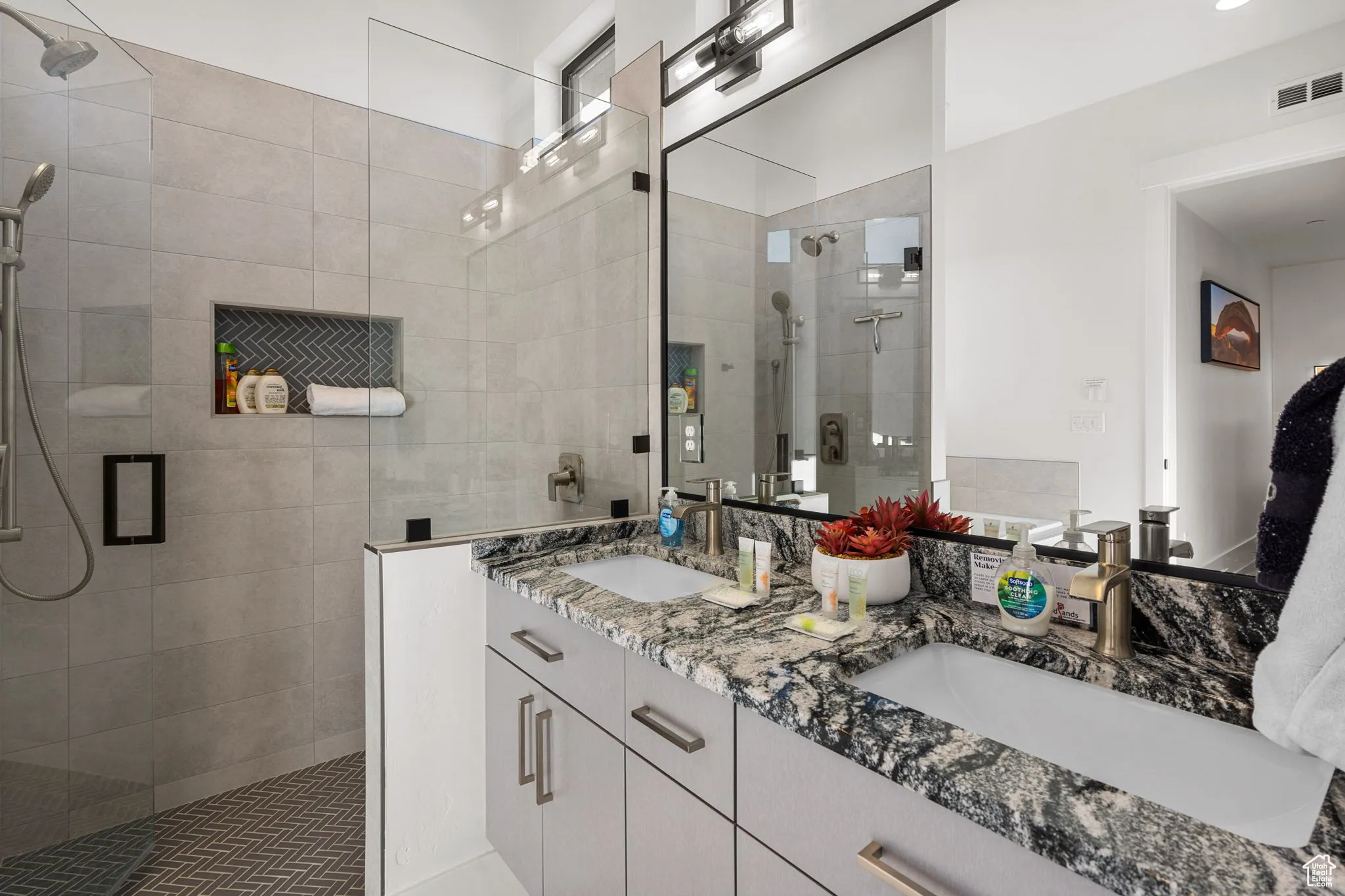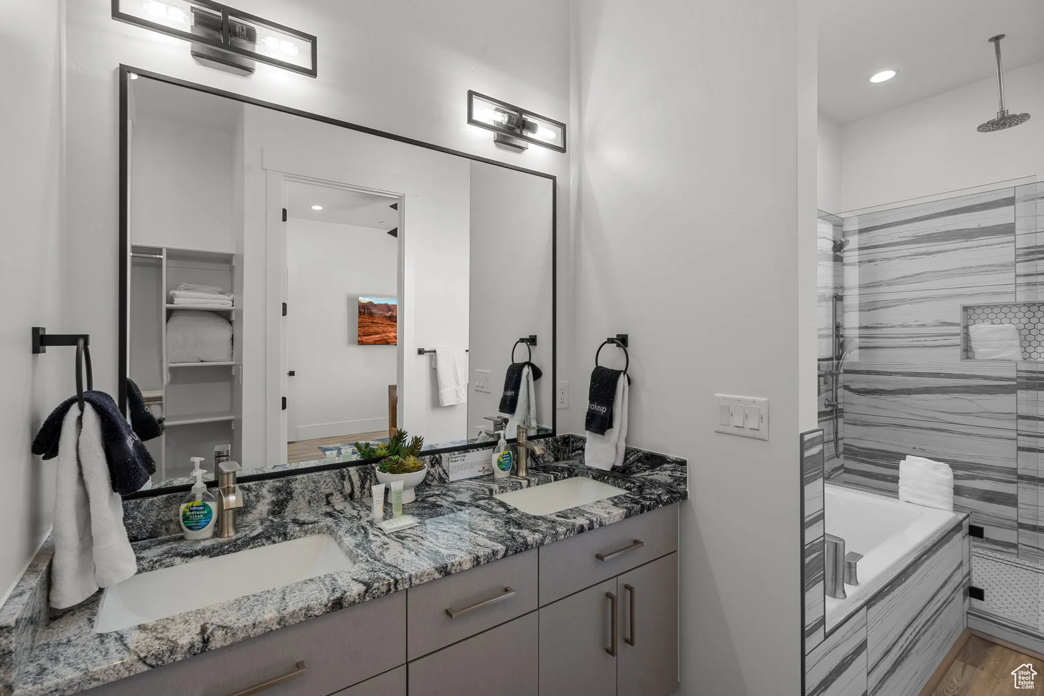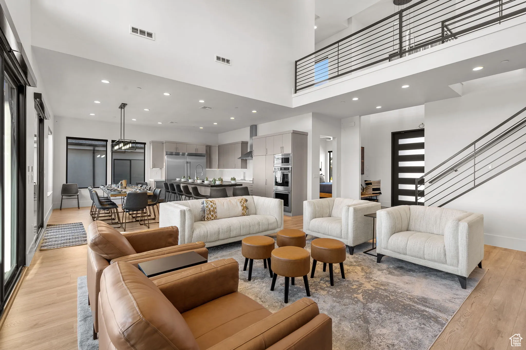 Fractional ownership available. This newly built custom home seamlessly blends modern and rustic styling as you open the large custom pivot door into the entry with lofty ceilings, modern fixtures and rustic wood accent wall on the towering fireplace in the great room. The large kitchen with hidden pantry, built in ice maker, full size side-by-side fridge and freezer and two dishwashers makes it great for entertaining. A set of double sliding doors on the main level open the great room up to a large deck with hot tub where you can take in the sunset or overlook the backyard featuring a pool and hot tub, outdoor fire pit with built in seating, putting green, pool bathroom, and outdoor kitchen area. Full daylight walkout basement with 10′ ceilings also features double sliding doors out to the covered patio, making the transition from indoor to outdoor living effortless. Back inside you’ll find 5 primary style bedrooms each containing en suite bathrooms. Two additional bedrooms on the upper level have built in bunk beds. The garages offer storage space for all your toys- with an RV garage on a suspended slab and extra garage underneath. RV garage also features a condensed pickleball court and basketball standard. House is just a 5 minute drive to Sand Hollow Reservoir. 3 minute walk from all-abilities park with dog park and pickleball courts. Whether you are looking for a vacation home or to feel like you’re on vacation at home, this custom home was designed for you. Furnishings and household goods are negotiable and may be added with a separate bill of sale for $120,000 making this home turn-key. Listing agent is related to seller.