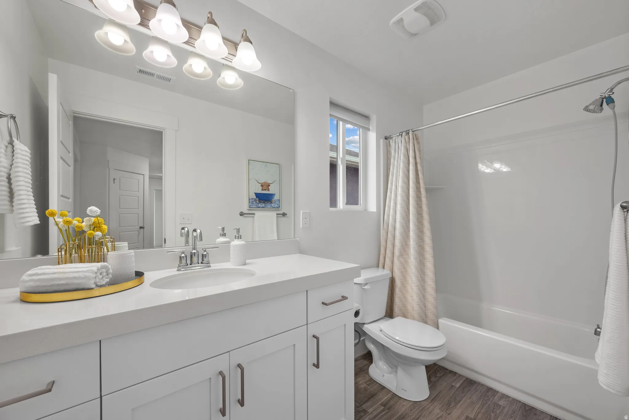 Better than new! This beautiful, immaculate home includes beautiful, complete landscaping including an extended concrete back patio, a paver patio with a gas fire pit and vinyl fencing. Designer upgrades include a beautiful tile backsplash, roller shades on windows, designer paint & wallpaper, and an electric fireplace in the great room. Water softener and reverse osmosis and video doorbell. Stainless steel appliances including washer & Dryer and fridge. This home is truly move-in ready. Several parks in the neighborhood. Minutes from great elementary, Jr & Sr High schools. Minutes to shopping and dining. Easy access to Pony Express and Eagle Mountain Blvd. Approx 25 min to Lehi, 45 min to Salt Lake, 35 min to Provo. All info is provided as a courtesy. Buyer or Buyer’s agent to verify.