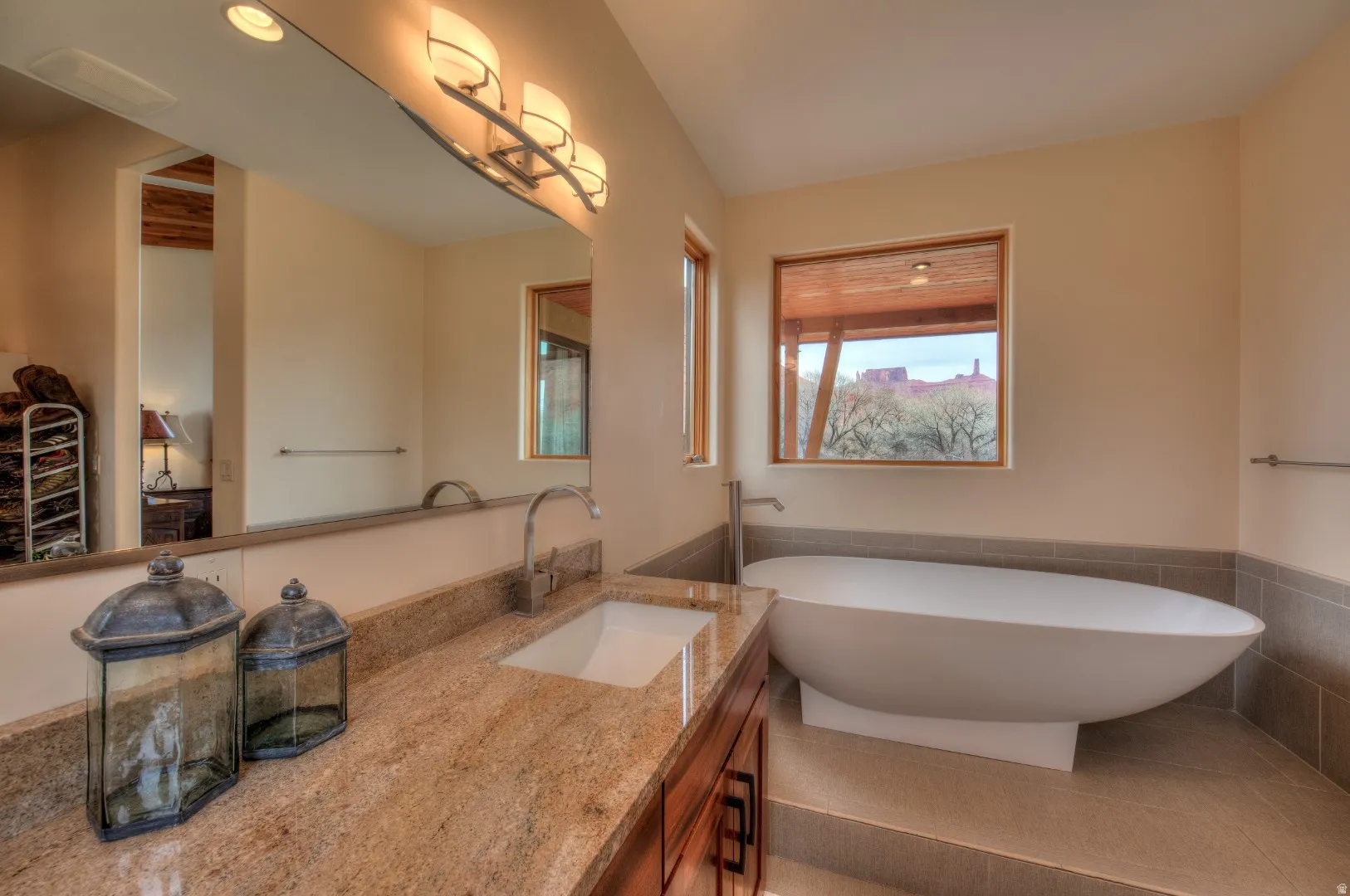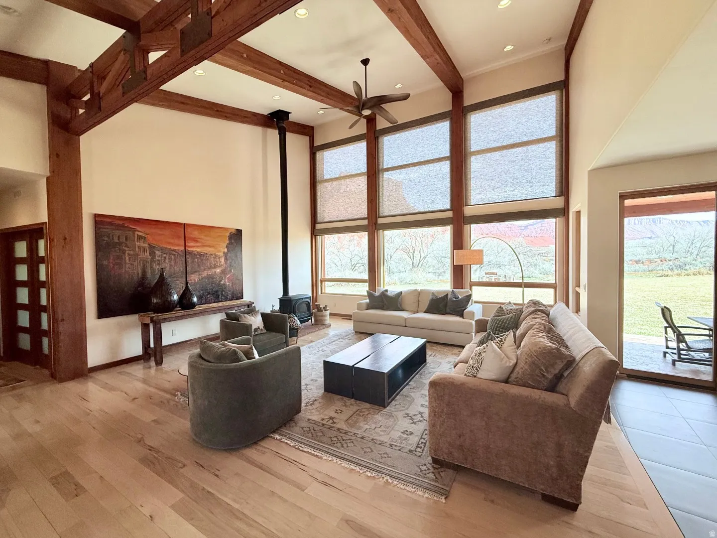 Situated on 5-acres, surrounded by breathtaking views of red rock formations and the La Sal mountains, this 4-bedroom, 3.5-bath home delivers the ultimate experience in desert living. The bright main living area features vaulted ceilings, solid hickory floors, and a wood burning fireplace, with expansive windows that frame the beauty of nature. The open plan kitchen is graced with custom built African mahogany cabinets and granite countertops. Sliding glass doors open to the porch, seamlessly blending indoor and outdoor living. Outside, a covered carport separates the home from the oversized two-car garage. The garage features a climbing wall that extends to the ceiling